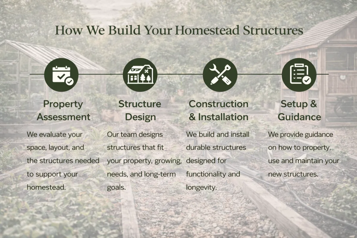 We design and build essential homestead structures that support food production, livestock care, and long-term garden success.