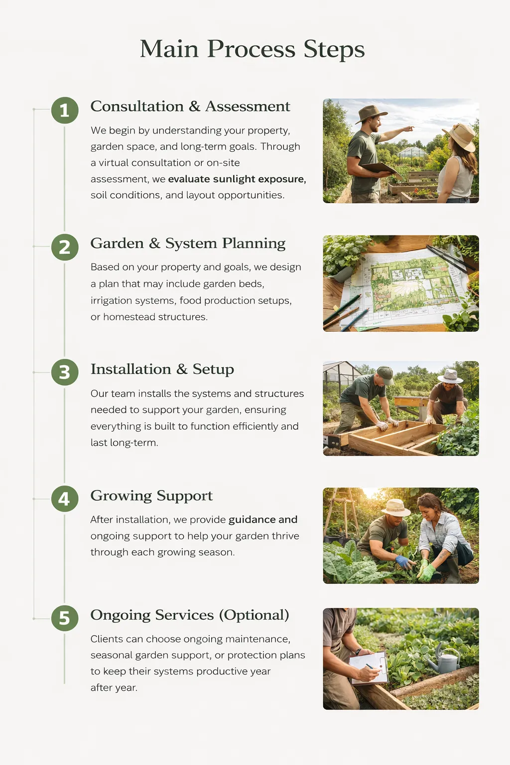 Every property is different, which is why we follow a clear process to understand your space, design the right systems, and build solutions that support long-term food production.