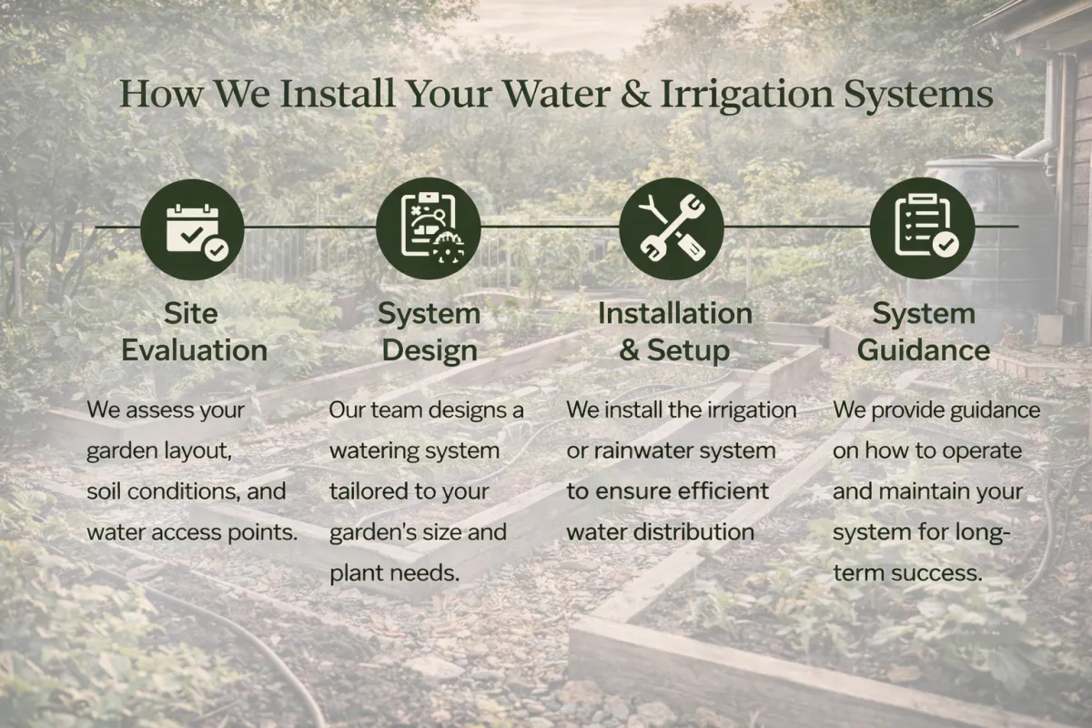 We design and install efficient watering systems including rainwater collection and irrigation setups that keep your garden healthy while conserving water.